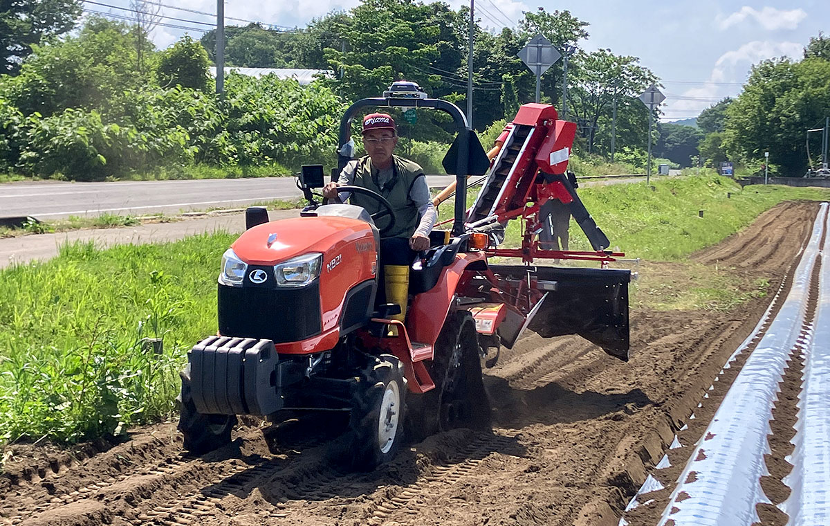 「トラクターの操作には熟練の技術が必要なため、うちの農場でマルチシートを張れるのは私だけでした」と話す、髙橋さん。今回の支援で「自動操舵機器」を取り付けたところ、面積に応じたシート貼りの本数も計算してくれる上に、トラクターの操作も自動化されているため簡単で正確。新規就農者でもアルバイトでも真っ直ぐシートを貼ることができ、作業効率がアップしたという。色々な形状の畑でも活用できるため、地域内に普及していくことを、髙橋さんは期待している。
